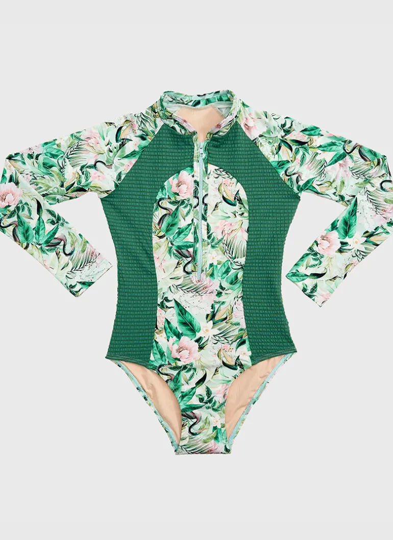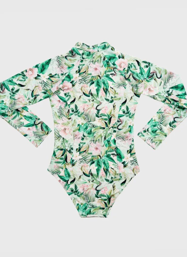 The Marabou Long Sleeve One Piece by Aqua Blu Australia is a must have this summer. Protecting your child from UVA and UVB rays, this one piece boasts a UPF Sun Protection Rating of 50+
