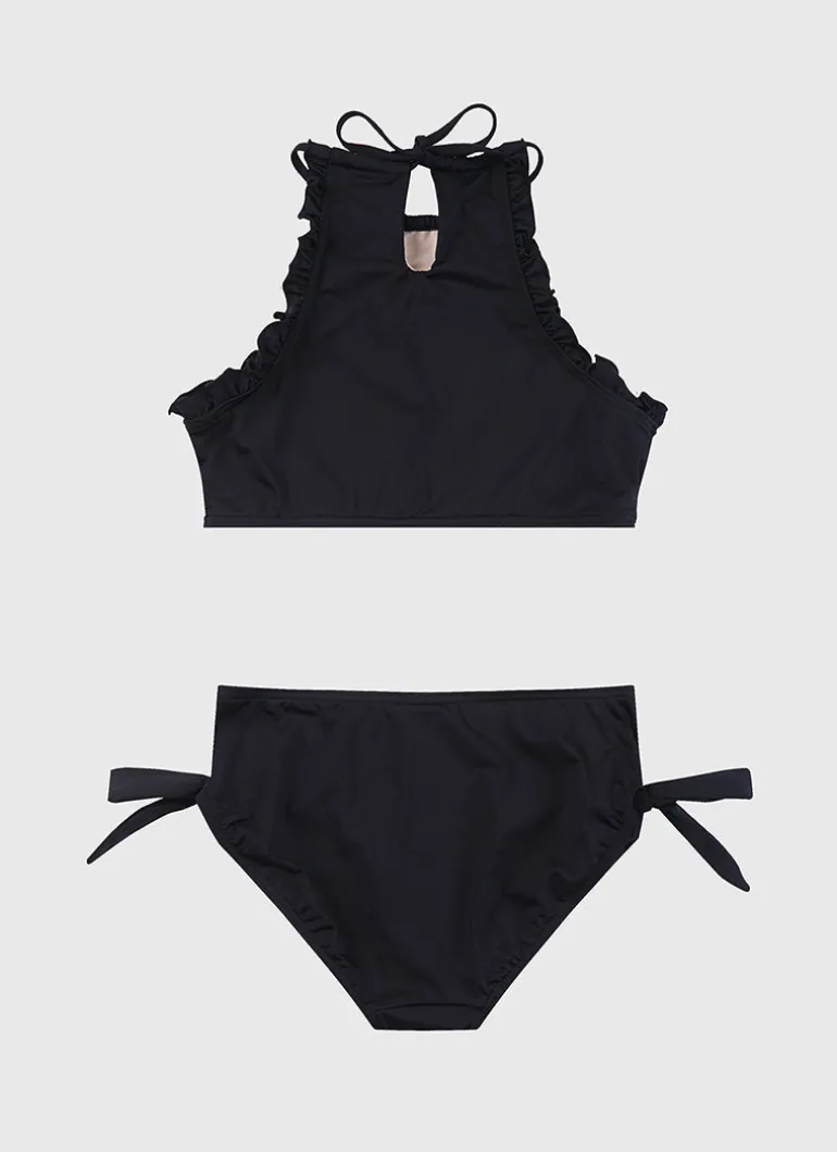 – Adjustable halter neck tie with frill detail and faux tie side pants
