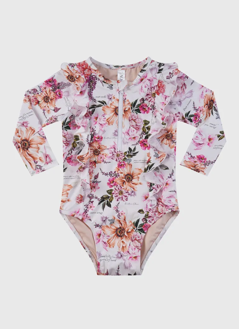 The Chase Long Sleeve One Piece by Aqua Blu Australia features a UPF 50+ sun protection rating. It’s the perfect choice for your little ones to stay stylish and protected at the beach or pool.