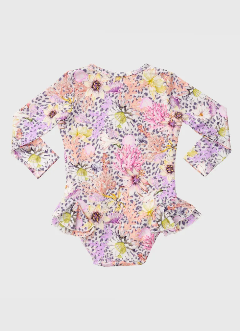 Designed to protect your child from harmful UVA and UVB rays, the Daisy Long Sleeve One piece by Aqua Blu Australia is essential for those long hot summer days spent on the beach.