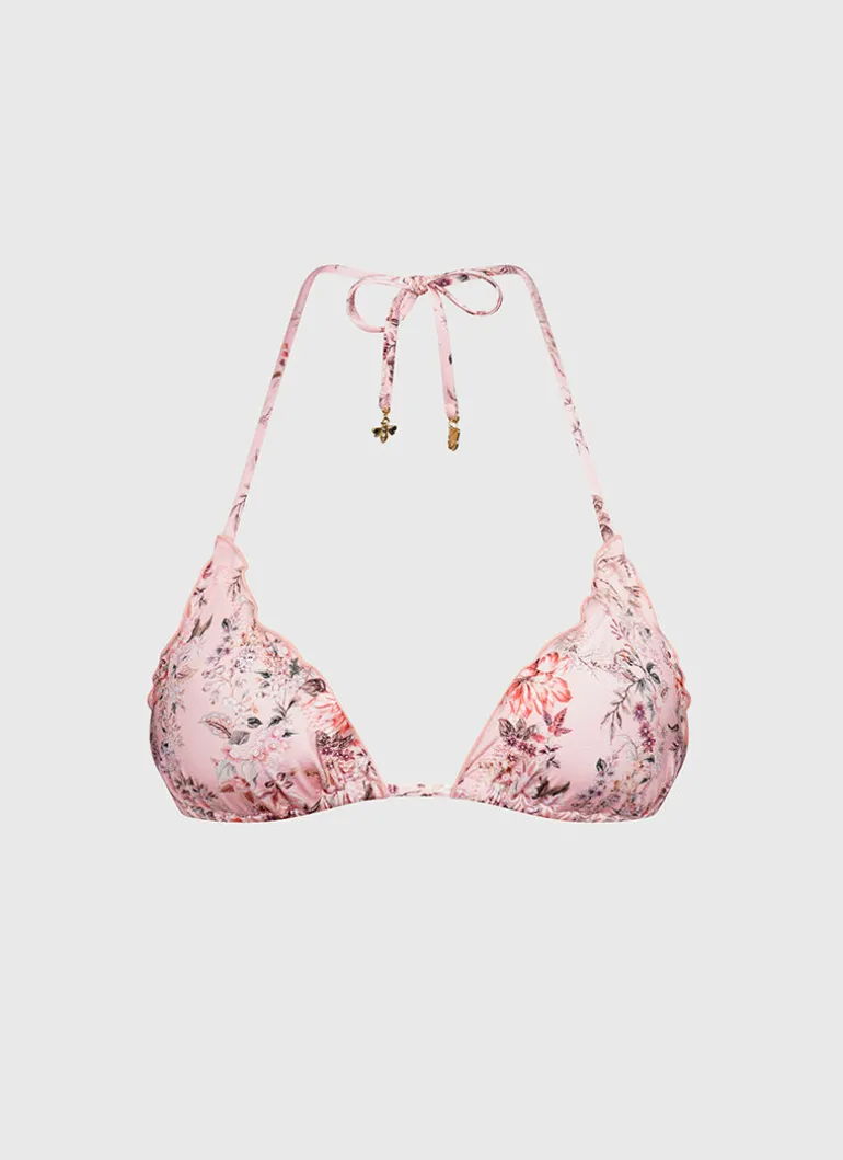 The Periwinkle Sadie Triangle by Aqua Blu Australia is a classic bikini top with a luxurious twist. Its delicate lettucing detail adds a touch of femininity to the timeless triangle shape, perfect for the beach or day by the pool!